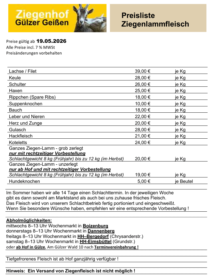 Vorbestellung: Um Ihre genauen Wünsche erfüllen zu können, empfehlen wir eine Vorbestellung rechtzeitig vor dem jeweiligen Schlachttermin. Preisliste: Ziegenfleisch (PDF) |